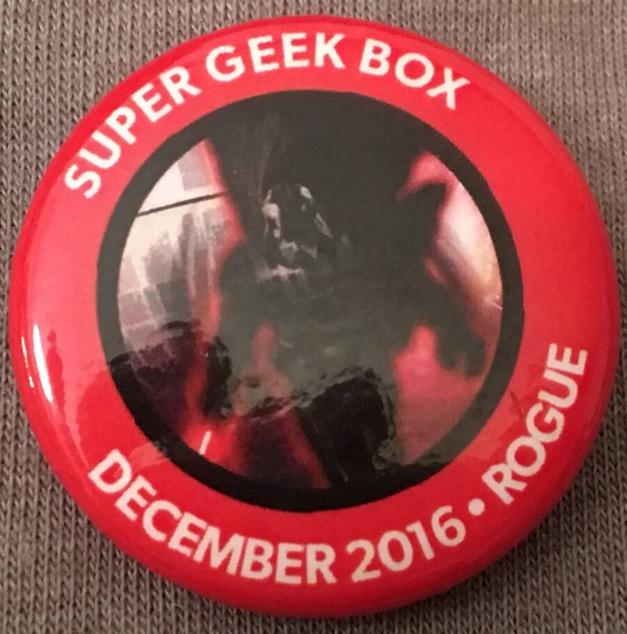 Finally, we have the December 2016 Super Geek Box button pin displaying the month and the theme, “Rogue.” I guess these boxes were not put together after the passing of Carrie Fisher or we may have seen a completely different lineup of content.