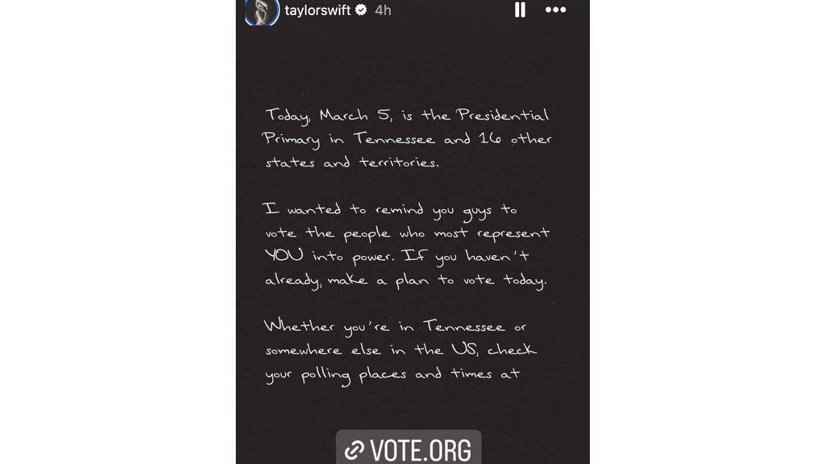 “Today, March 5, is the presidential primary in Tennessee and 16 other states and territories,” Swift began her message.