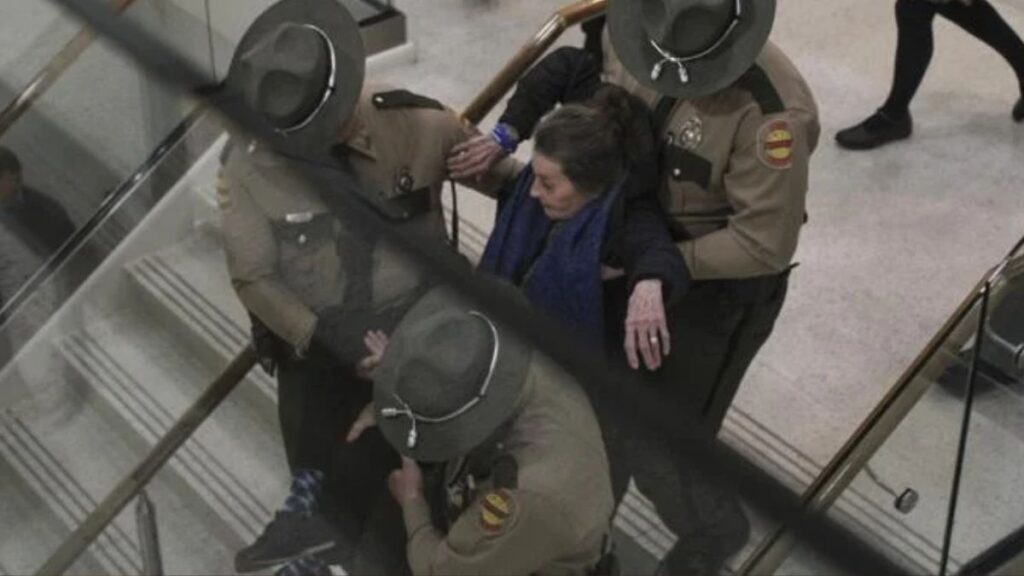Eighty-year-old Lynne McFarland refused to stand up after the meeting had concluded, causing police to approach her. They had tried to get her to stand up willingly, explaining that there would be charges involved otherwise. After a while, officers carried McFarland out of the room, put her in a police car, and took her into custody. As a result of her behavior as well as for resisting a search of her body, she was charged with two misdemeanors.