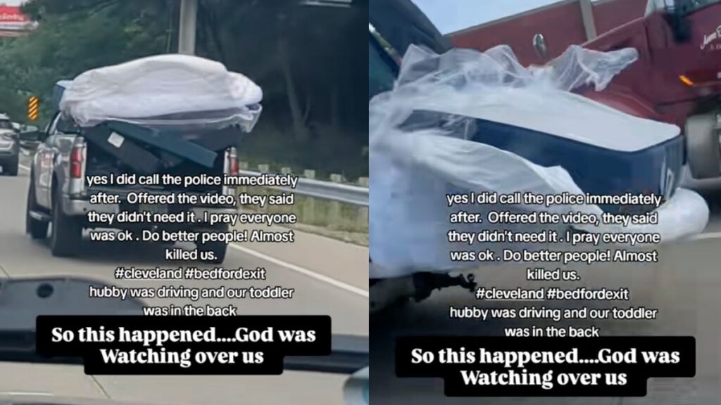 The viral video has since racked up thousands of views as people expressed outrage at the driver’s careless actions. Many pointed out that not only was the load improperly secured, but the maneuver of cutting into another lane just before the mattresses flew out made the situation even more dangerous. For the Cleveland, Ohio, family, it was a nightmare narrowly avoided.