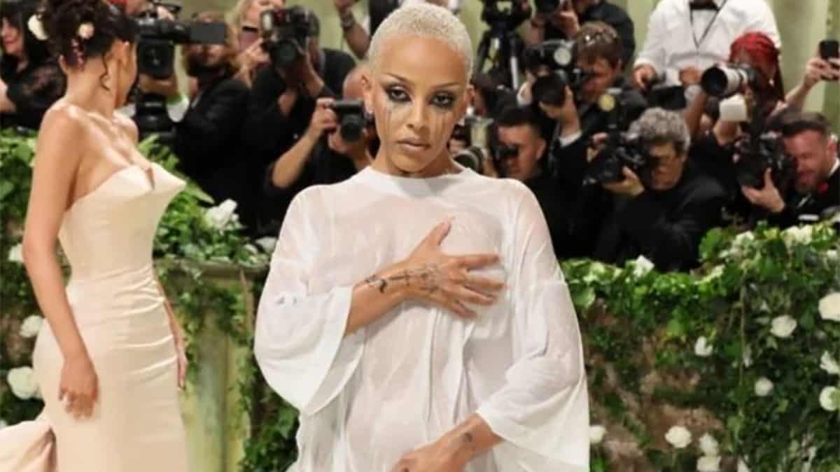 Doja Cat arrived in the absolute worst look of the 2024 Met Gala. She wore a white bath towel wrapped around her head with a floor-length oversized white t-shirt, paired with a crying makeup look and platform heels. It’s obvious that this style didn’t even hint at the evening’s theme or dress code.