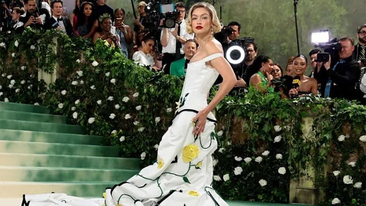 Gigi Hadid’s look this year was quite bold, and more of a masterpiece than a gown. She wore a white corset dress with a white silk suit coat hanging from her hips. The whole dress is covered in vibrant green vines and leaves, as well as yellow roses, which are all hand crafted out of millions of beads.