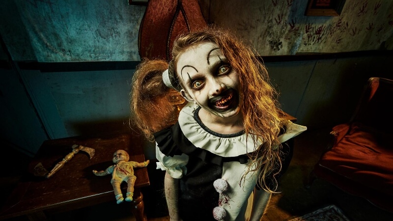 Flashing forward to the midway point, Sienna’s friend Brooke drops molly (ecstasy) in her drink without her knowledge, thus triggering a panic attack and forcing Sienna, Brooke, and Brooke’s boyfriend Jeff to leave a Halloween party. On the drive home, Sienna receives a call from Jonathan, who (unbeknownst to her) was incapacitated and abducted by Art the Clown and his new accomplice, credited as The Little Pale Girl. In order to trick Sienna, The Little Pale Girl imitates Jonathan’s voice to communicate a desperate plea, asking Sienna to meet him at an abandoned carnival.
