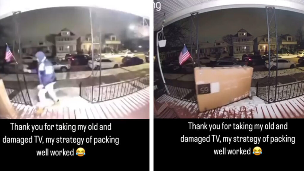 Shared by MintedVibez on Reddit on the r/funny subreddit, we can see a man approaching a home and carrying away a large box. According to the annotation on the video, the thief arrived to steal an old and damaged TV. It would seem that it was an intended strategy all along. It’s uncertain if the thief brought the damaged TV back, but if he didn’t, he at least helped the house owner clean his porch.