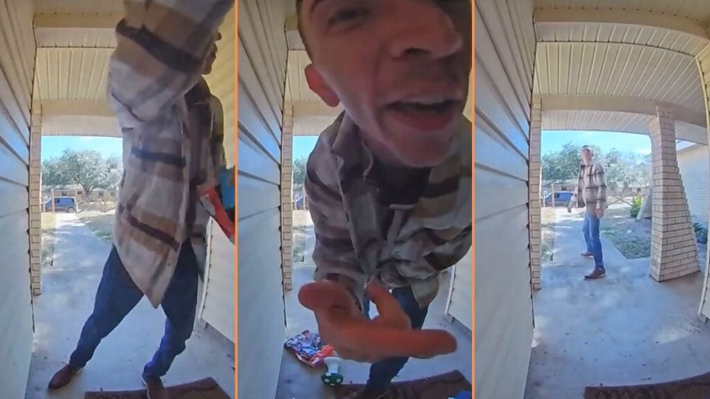 The above video was posted to the TikTok account @emyleepriem, belonging to a mother and wife named Emylee Capetillo in Texas. It shows a man walking up to her door and immediately throwing different items, kicking down decorations, and even yelling expletives into the doorbell camera.