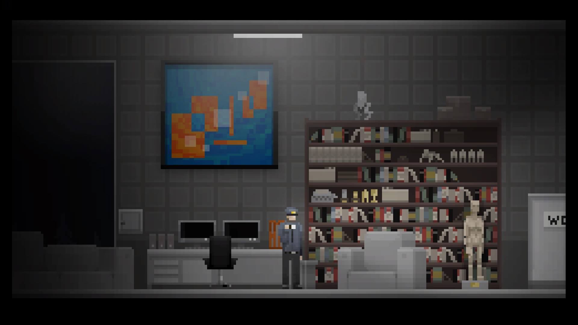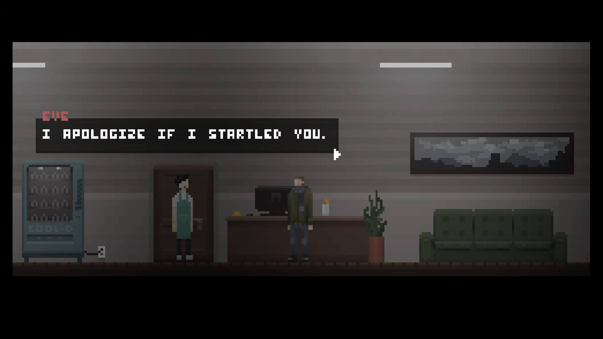 Perhaps an intentional juxtaposition, Uncanny Valley is a retro-style horror game created by Cowardly Creations as their first game. In it, you play as Tom, a man who takes a job as a security guard for an abandoned science facility and its adjacent apartment complex. Your coworker, Buck, gives you a walk around and instructs you of your nightly shift obligations. Besides the two of you, the only other person around is a woman named Eve who takes care of the apartments and keeps them from falling apart.