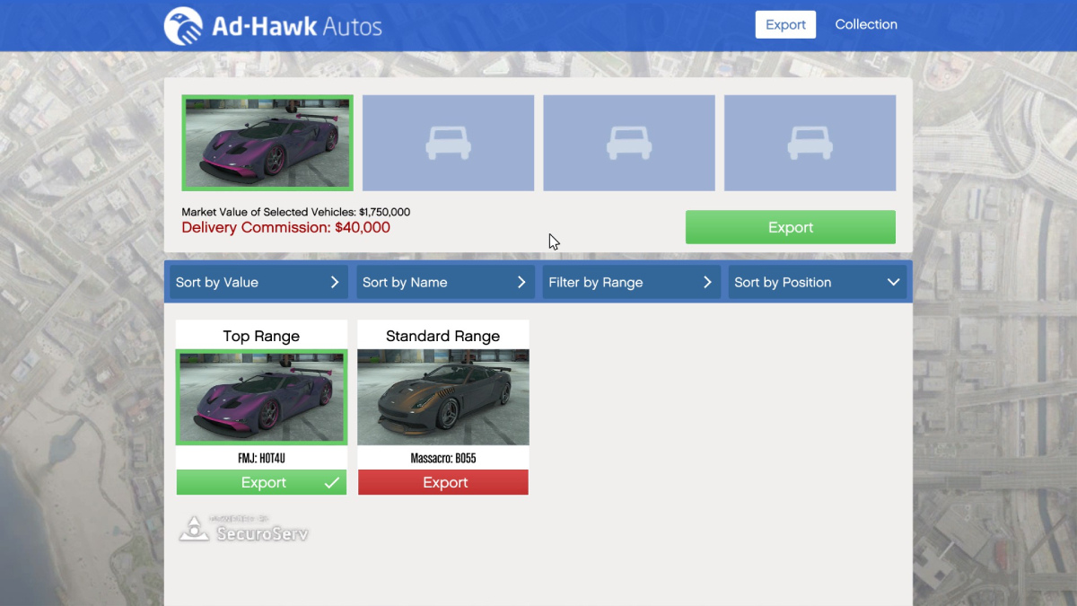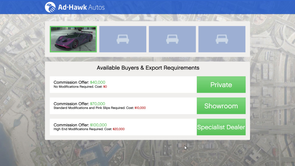 As you can see, it has several things, including the cars you’ve stolen and four slots to export up to four vehicles. If you’re playing solo, you can only export one car at a time. For a bigger sale, hire more associates to help you deliver your vehicles.