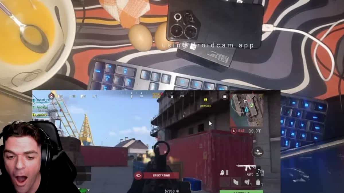 The streamer has put his phone on a platform, face down, so that he can show you how it burns when he’s playing Warzone Mobile. He’s using a controller and has shared his mobile device’s screen on a monitor. After a while, the phone gets to a point where it starts overheating, and that’s where he rubs egg liquid on his device’s back.