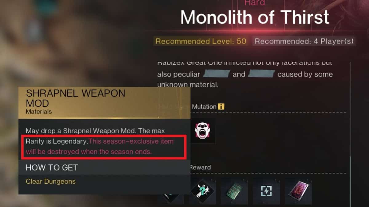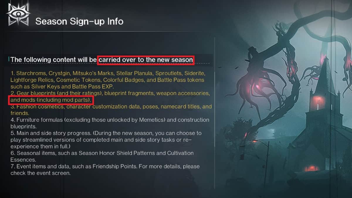 Perhaps it could mean that Mods will still get destroyed on that outgoing Season and then forcibly transferred to the incoming Season. But then that would be redundant since Seasons get wiped anyway. Suddenly some Mods will not be transferred? In any case, it’s not clear what the red text meant and what it could mean for the Season wipe.