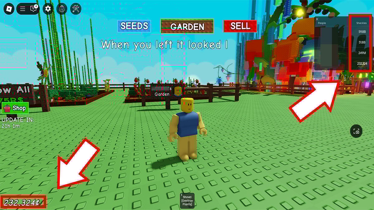 Your current Sheckle balance is displayed in the bottom left corner of the screen. You can also check the leaderboard in the top right to see how you stack up against other players in the server.