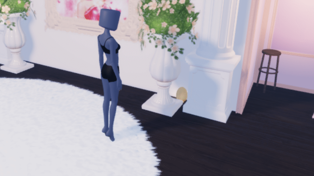 You’ll find eight Easter Eggs within the main lobby, aka the dressing room in Dress To Impress Roblox. The order in which you find them doesn’t matter, and they will always spawn in the same location. In other words, things aren’t randomized. Let’s start with the one right under Lana’s desk, sitting beside her feet.