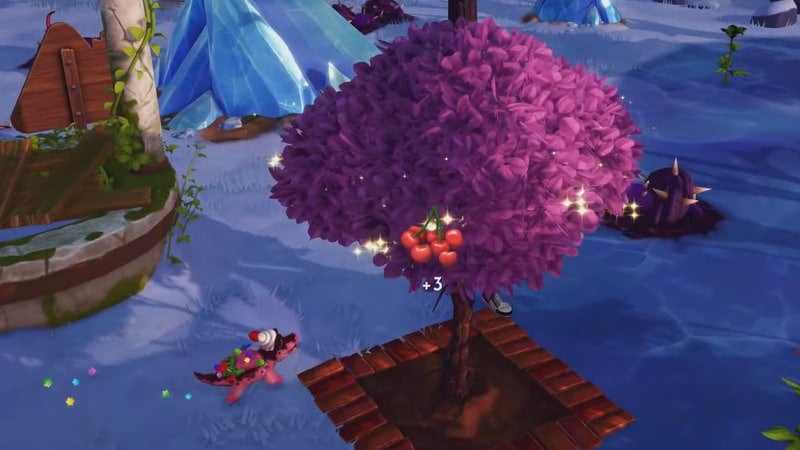 Once you visit one of the biomes, you should take a short walk and look for low trees with pink leaves. These are especially visible against the backdrop of white snow in Frosted Heights. Once you find such a tree, you need to interact with it, after which you will receive berries. From each tree, you can collect three Cherries at a time. After that, you can wait 33 minutes and pick the berries again.