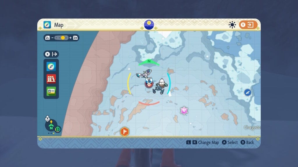 While it might seem odd, Torchic is found in the Polar Biome in The Indigo Disk. It makes sense in context since Torchic is only found in one particular cave in the area, which would be warm enough for a fire Pokemon. This cave is located on the cliffside, south of the Polar Plaza, where the Elite Four battle occurs. The cave contains a Tera Metang, so you can look for the golden sparkles for confirmation that you have the correct location. Below is an image of the map showing where I’m standing in the above image.