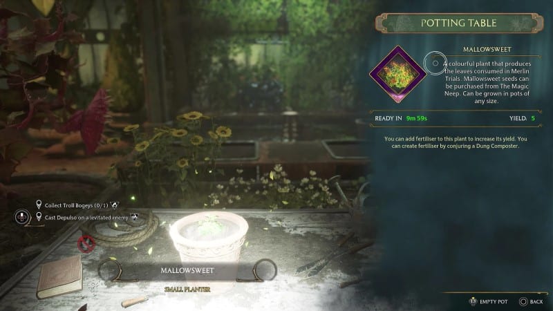 Regardless of what you plant them in, Mallowsweet Leaves take 10 minutes to grow in Hogwarts Legacy. You can’t be in the menu screen as that pauses the in-game timer.