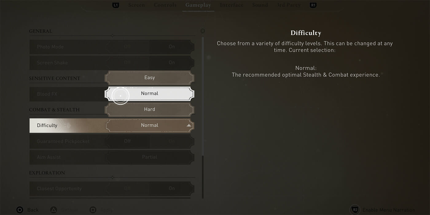 You can change the difficulty in Assassin’s Creed Mirage at any time by going into the Main Menu and selecting Options. Shift to the Gameplay Tab and scroll down to find the Difficulty setting. The default difficulty is Normal, but you can also choose between Easy and Hard. You aren’t told that you can change difficulties, and it’s useful in case you are struggling or need a challenge.