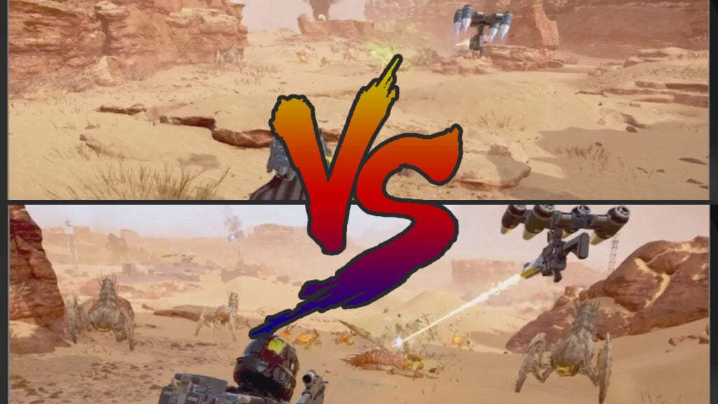 We found that the Laser Rover Guard Dog outperforms the Gun Guard Dog in most situations. In terms of range, both seem to engage any enemies they see at around 11 to 13 meters or 36 to 42 feet. Though on the one hand, the Gun Guard Dog deals slightly bigger damage than the Laser. Three quick shots can easily destroy a weak Scavenger Terminid while it takes about 1 second of constant laser stream to kill one.