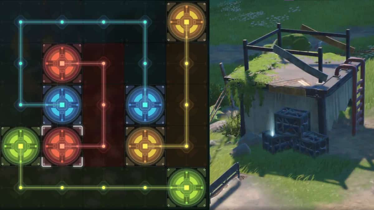 In the same robot camp, there is a Communications Device that you must hack to find another piece. To hack the device, connect the nodes of the same color as in the image. Then,ย theย Exile Camp location will appear; you must defeat a group of exiles there. When you defeat them, you will see a blue glow on some metal tube boxes. That is theย Power Supply Pack.