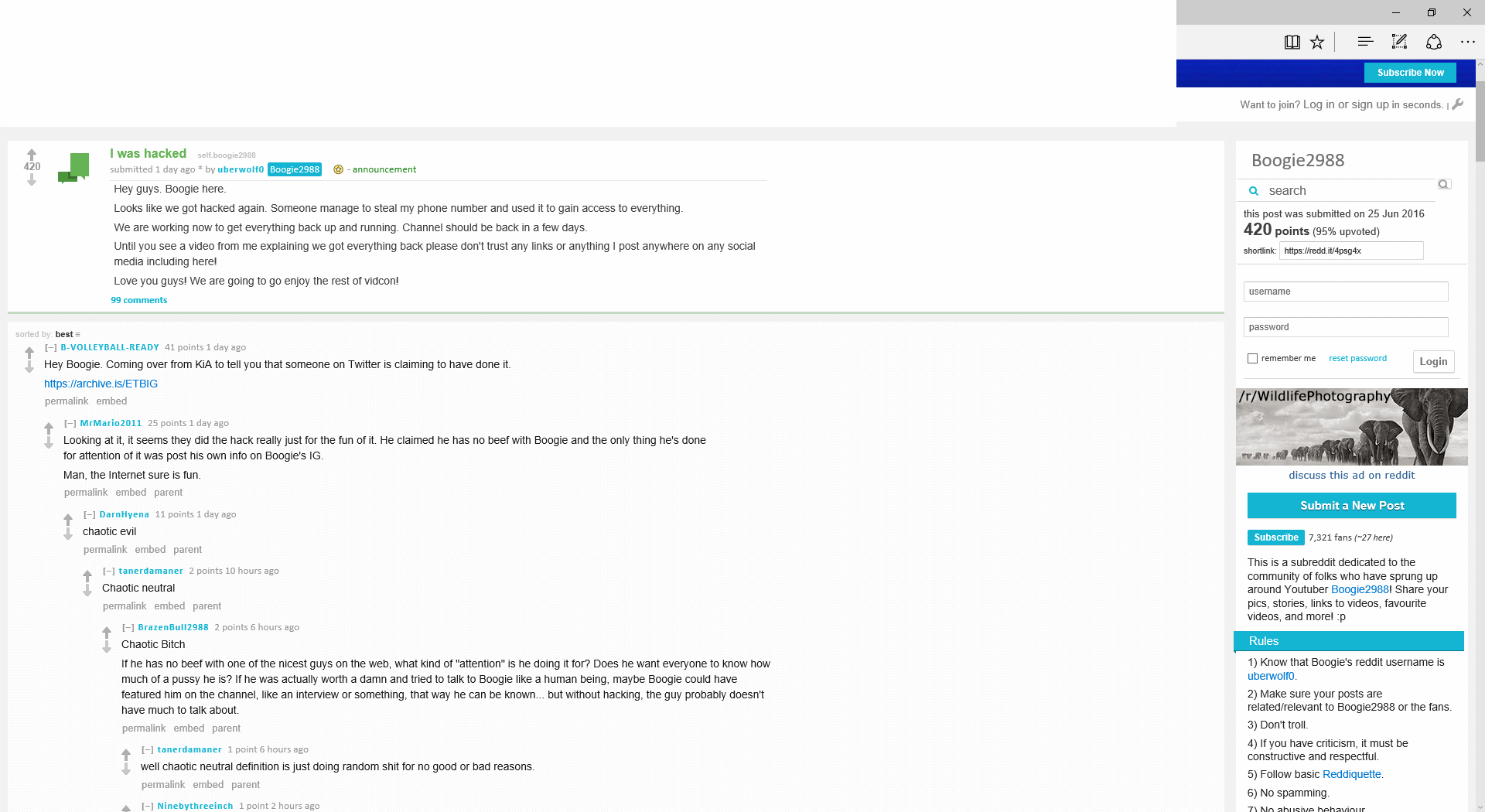 This weekend famous youtube personality Boogie2988 had his videos vanish without a trace. Fans were wildly speculating as to what could have happened. Did Boogie call it quits? Did someone report his account? Was he hacked? After almost a day without answers, it appeared Boogie was a victim in a hacking attack. This became clear when the real Boogie posted on Reddit explaining what had happened. Readersย can see his Reddit post here. For viewerย convenience, we also have it in a screen grab for you.